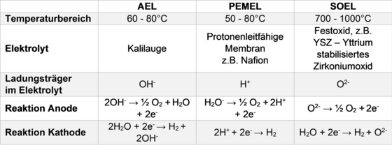 Die Herstellung von grünem Wasserstoff erfolgt mittels Wasser-Elektrolyse. Für die Elektrolyse kommen die 3 Technologien AEL, PEMEL und SOEL zur Anwendung. Die Reaktionsgleichungen an der Anode und Kathode sowie die Ladungsträger sind der Tabelle zu entnehmen.