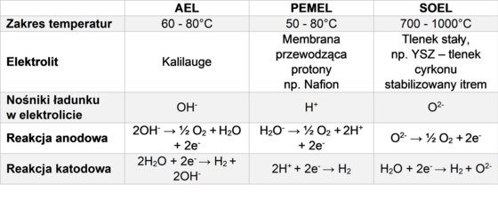 Zielony wodór jest wytwarzany poprzez elektrolizę wody. Do elektrolizy wykorzystywane są trzy technologie: AEL, PEMEL i SOEL. Równania reakcji na anodzie i katodzie, a także nośniki ładunku, można znaleźć w tabeli.